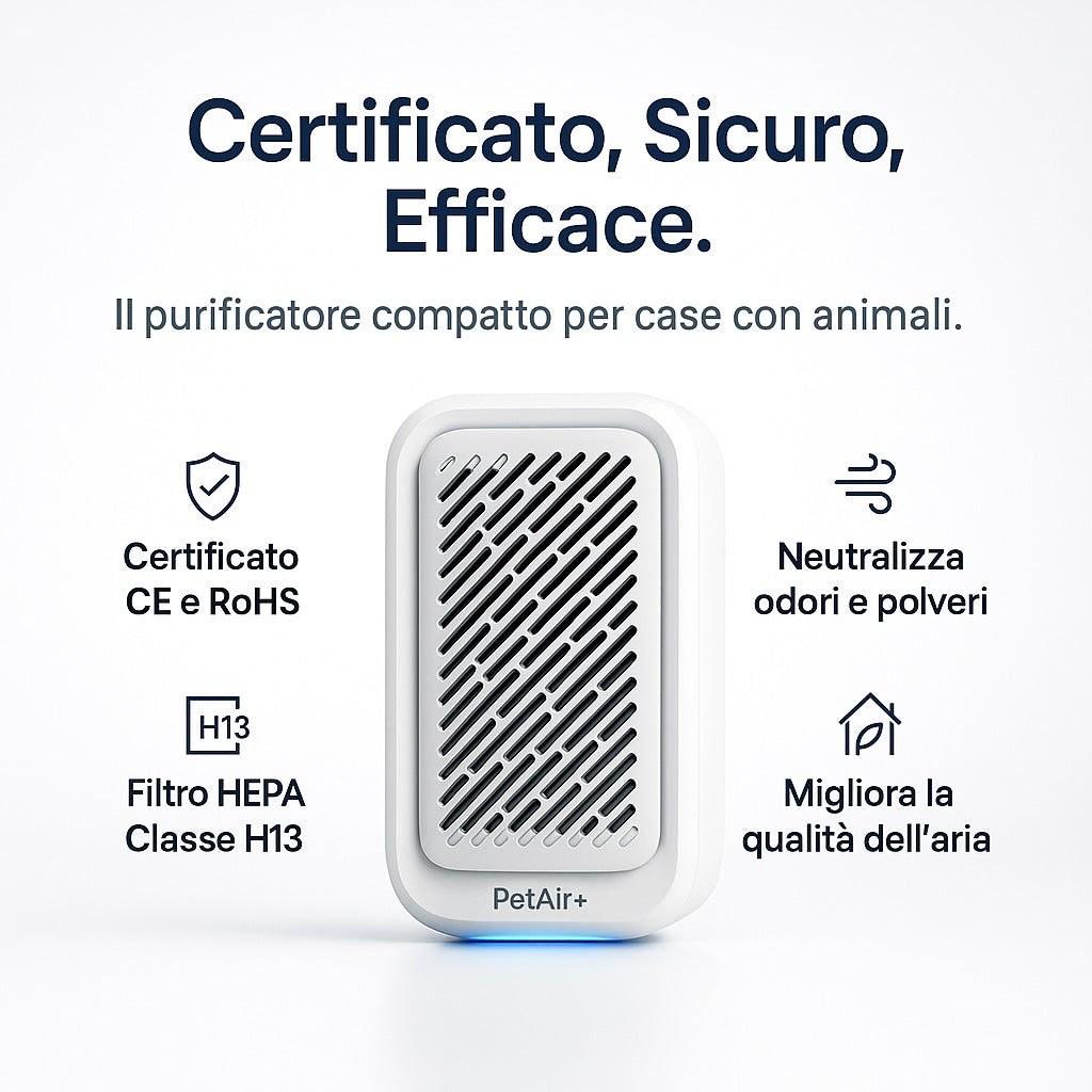 Certificato CEE, PetAir+™ è stato progettato appositamente per l’uso in ambienti domestici con animali. Utilizza un filtro certificato HEPA H13, carbone attivo e ioni negativi per catturare particelle microscopiche e neutralizzare gli odori senza rilasciare ozono né profumi artificiali che potrebbero disturbare l’olfatto sensibile di gatti e cani.